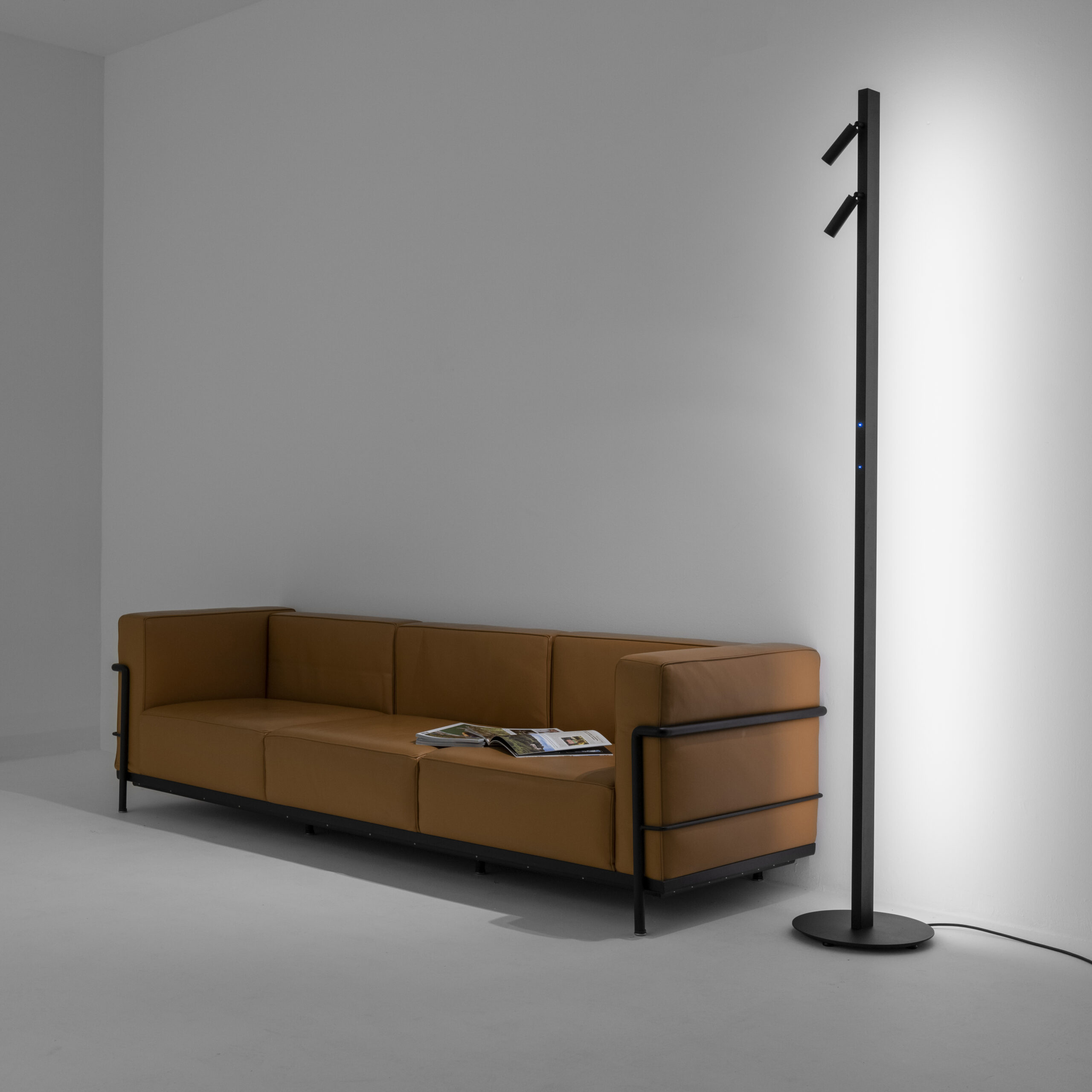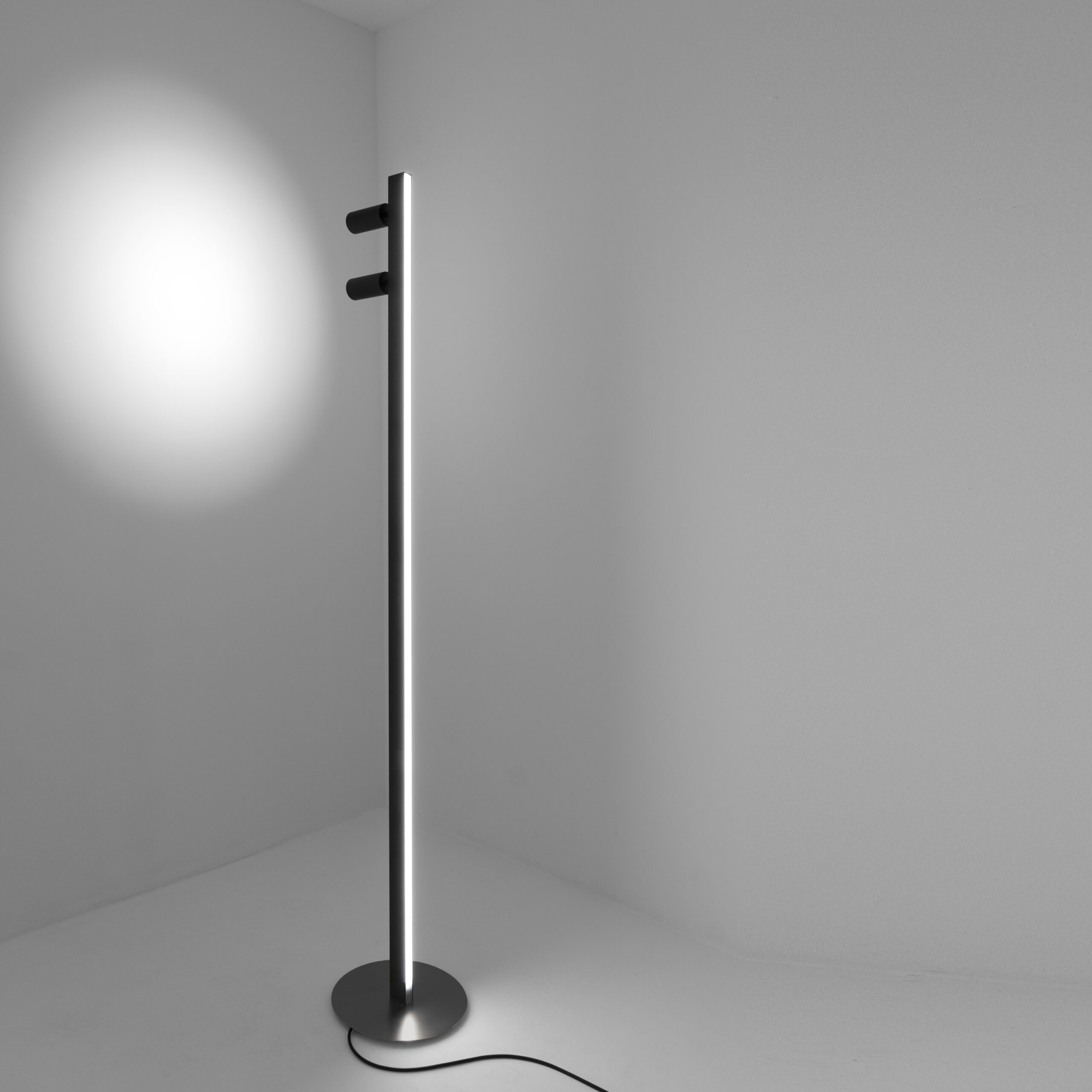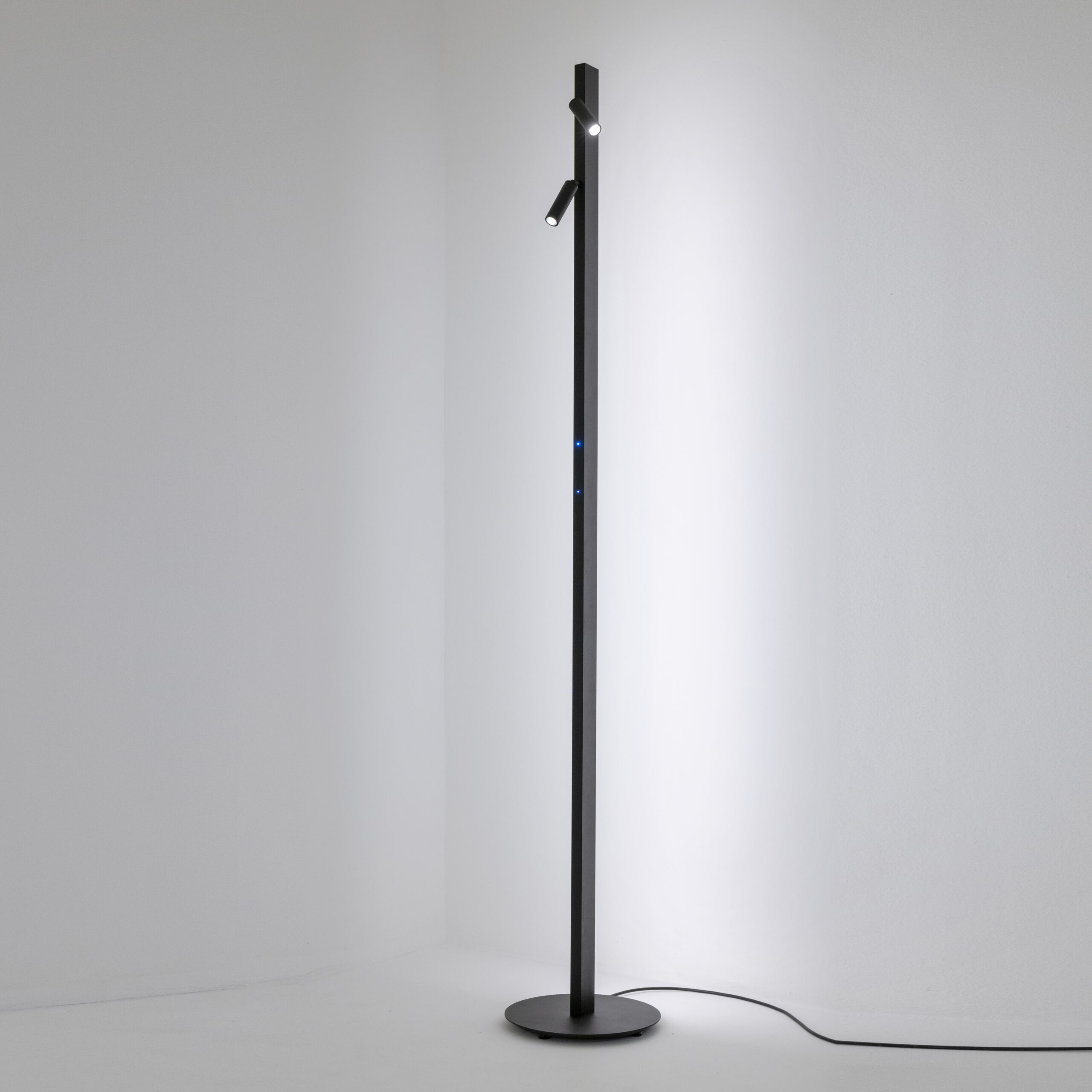 proiettori orientabili posti sulla parte frontale è arricchita da una luce diffusa posizionata nella parte posteriore, per una resa a 360 gradi. La tecnologia a portata di mano, due interruttori touch integrati permettono di controllare autonomamente ciascuna fonte luminosa e regolarne l’intensità. La completano un driver integrato nello stelo, una base di sostegno in apparenza sospesa ed un cavo elettrico tripolare da 2mt con spina. Il grado di protezione contro la penetrazione di polvere, corpi solidi e liquidi è IP40.