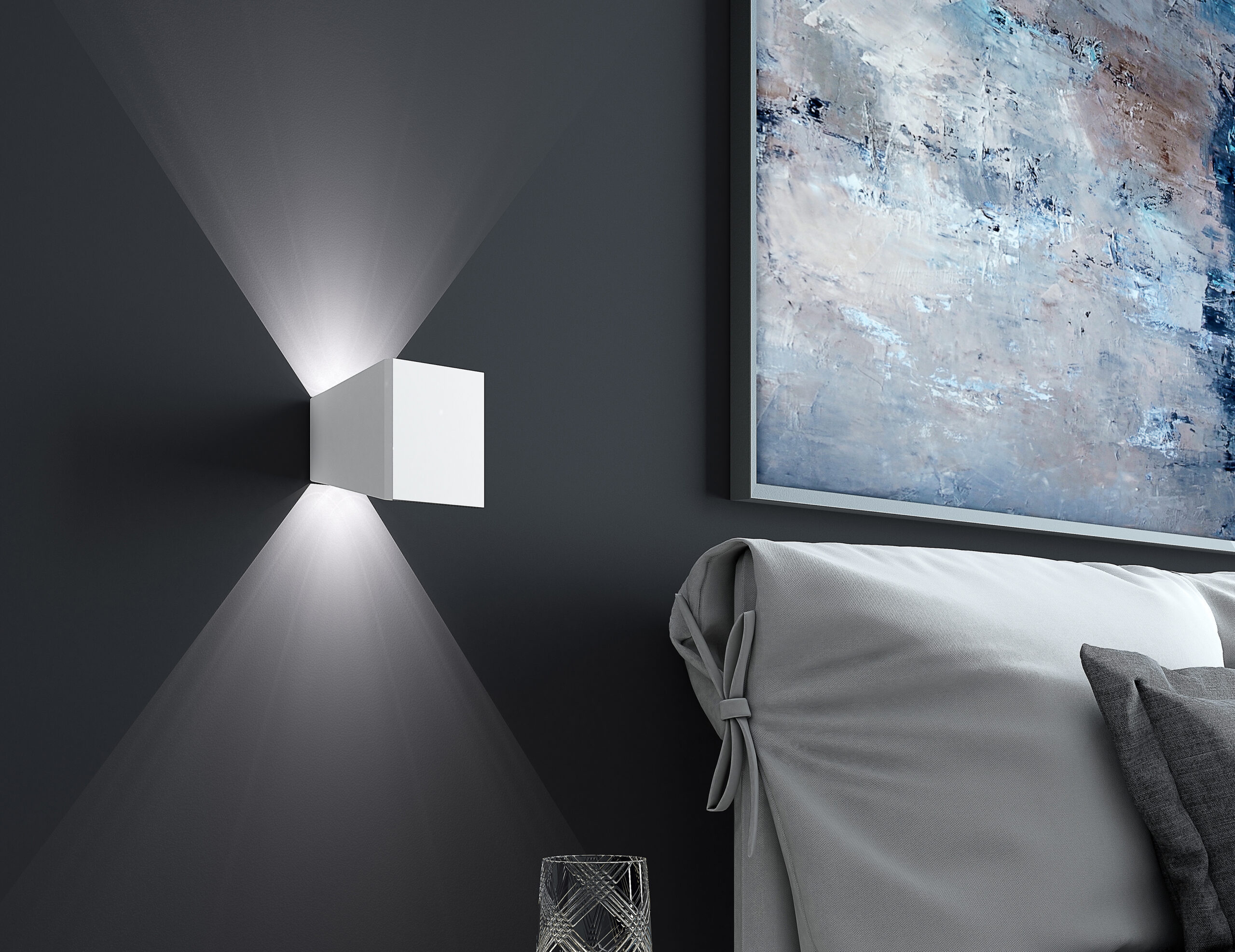 Un gioco di tagli simmetrici caratterizza Mia, apparecchio da parete biemissione realizzato in alluminio verniciato a polvere epossipoliestere stabilizzata ai raggi UV. Viene fornito con sorgenti LED ad alta efficienza con tecnologia Chip On Board e driver. Il grado di protezione contro la penetrazione di polvere, corpi solidi e liquidi è IP20.